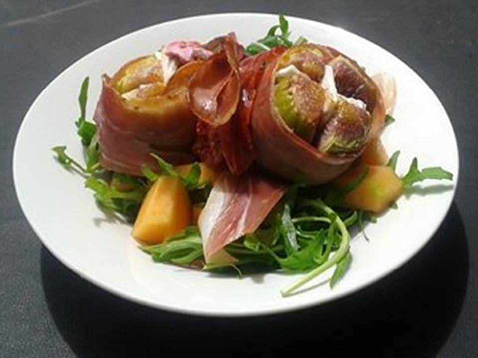 - Cut melon into small squares and mix with rocket leaves in a bowl.Place baked figs on top and drizzle balsamic glaze over salad.
